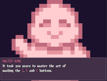 It's a tale about a monk who decided to prove himself worthy of following in his master's footsteps, by beating up hordes of enemies. It's by no means a serious game with serious characters. It offers ugly, yet charming homemade graphics, as well as fantastic music made by Final Perigee. Much nonsensical (but PG!) violence is to be expected.